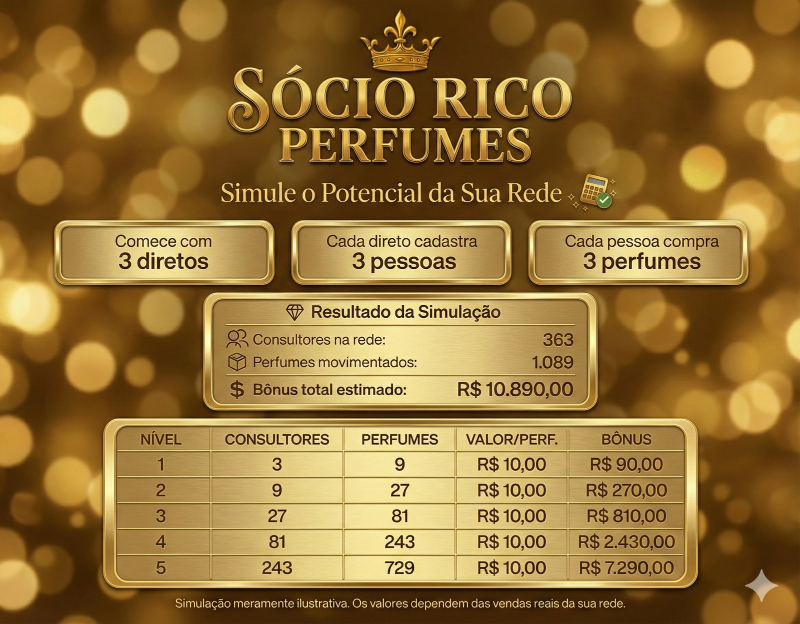 Como afiliado Sócio Rico, você pode lucrar com a venda direta dos perfumes e também receber comissões sobre o consumo da sua rede em até 5 níveis.